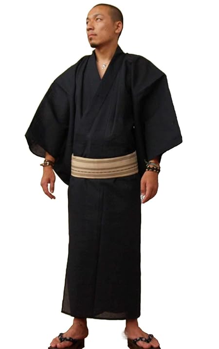 国産高級生地使用 浴衣 4点 セット (浴衣 帯 下駄 腰紐) メンズ 男性用 紳士 綿麻高級生地しじら (M, 黒)
