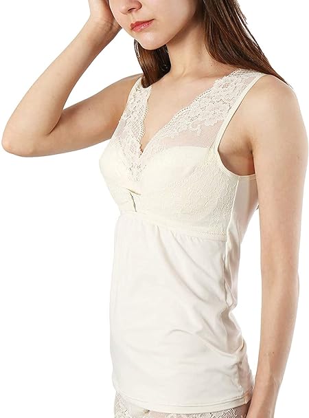 [Lulu Kushel.] 【公式】ルルクシェル くつろぎ育乳キャミ,ブラトップ,カップ付きキャミソール,ノンワイヤー,補正下着,ルームウェア,ナイトブラ,綿100%,レースインナー (L(4), アイボリー)