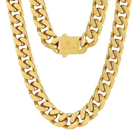KRKC&CO ネックレス メンズ 幅14mm k18金メッキ 人気 喜平 マイアミキューバンチェーン 太め サージカルステンレス 2面カット HIPHOP ラッパー B系 アクセサリー ギフトお祝い (18Kゴールド, 46cm)
