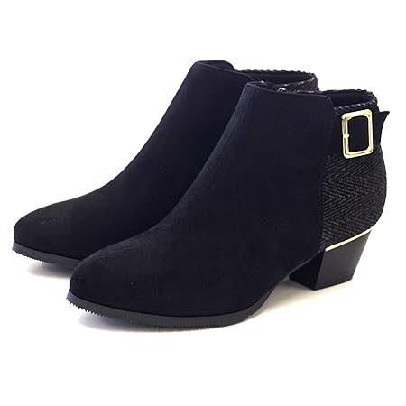 [アミアミ] 低反発 アンクルベルト ショート ブーツ チャンキーヒール KH630 (S(22.5cm~23.0cm), ブラック(スエード)×ツイード)