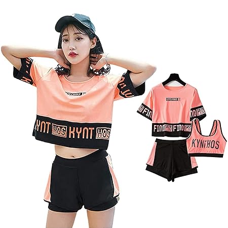[SYitong] 水着 3点セット 体型カバー タンキニ フィットネス水着 半袖 UVカット 運動風 女性用 盛れる 夏 海 プール 旅行 スポーツ 水陸両用 水泳用 韓国風 10代 20代 30代 中学生 高校生 学生 ママ水着 普段着 女の子 かわいい (オレンジ, XL)