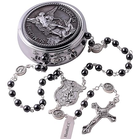HanlinCC 大天使聖ミカエル ヘマタイトブラックストーンビーズロザリオネックレス メタルギフトボックス付き 男性用, ヘマタイト。, 宝石なし