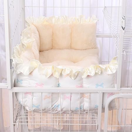 KUMORIJP ペット マット ケージ用 紐付き ペットベッド 落ちない 四隅紐付き ボア あったか 柔らかい かわいい レース装飾 洗える モフモフ ふわふわ クッション キャットタワー ソファ 多機能 犬 猫 小動物 敷く (カラフルリボン柄-ホワイトM(60×40×20cm))